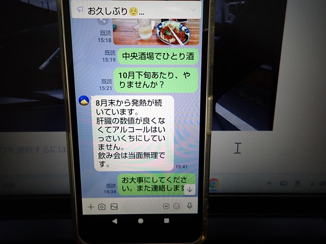 スマホから流れるライン電話の呼び出し音に目を覚ましたのが19時30分頃.. 一週間ばかり前に呑みにさそった時の返信では8月下旬から体調不良で当分酒は呑めそうにありませんと返信のあった親爺先輩(69才)からでした。目を覚ますとライン電話はきれていて、5分後に再び鳴ったので、でたら奥さんからでした..「夫が亡くなりました」.. この時をわすれないように寝床の写真↑を撮りました。