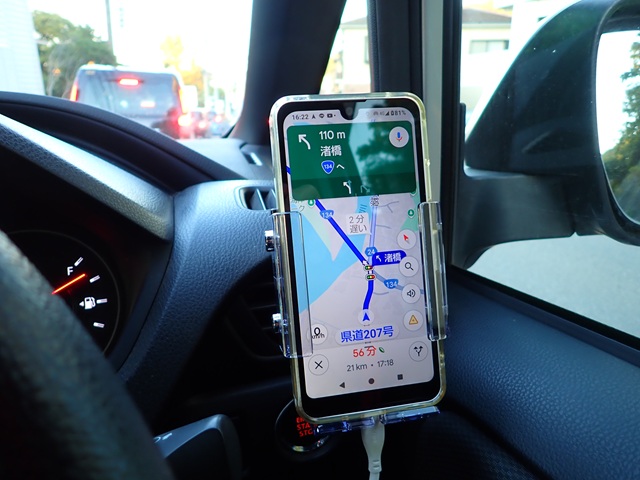 今夏の北海道放浪旅でグーグルナビ↑の使い勝手が良かったので この秋旅から採用することにしたスマホ ホルダーです。音声案内だけでも十分ですが、画面が見えればなお良いかと.. ¥1,700-だかで購入しました。