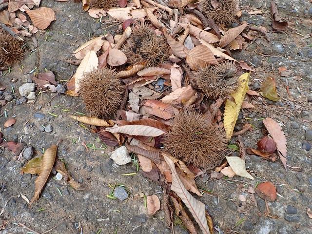 道に転がる栗を見て、徘徊は中止となりました。里山の柿にクルミや栗は月の輪の大好物だから..