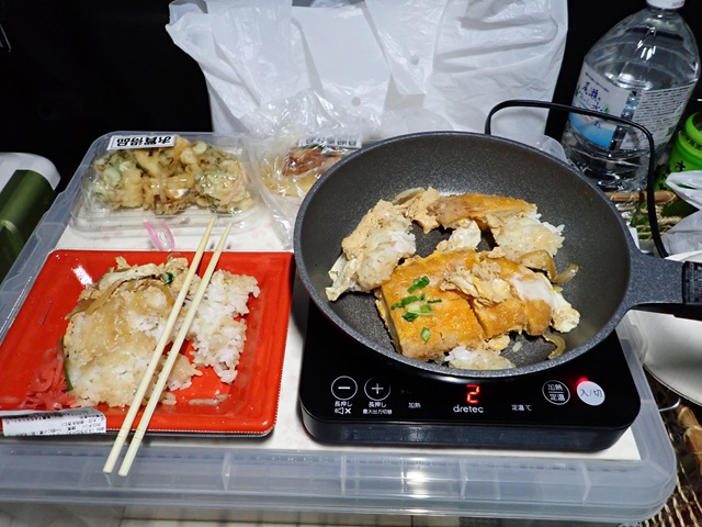 前回は半端ない寒さにしびれたので、 せめて温かい夕飯が食べられればと IHクッキングヒーターを使うことにしました。温めたのはパックに入ったカツ丼..