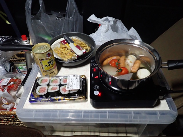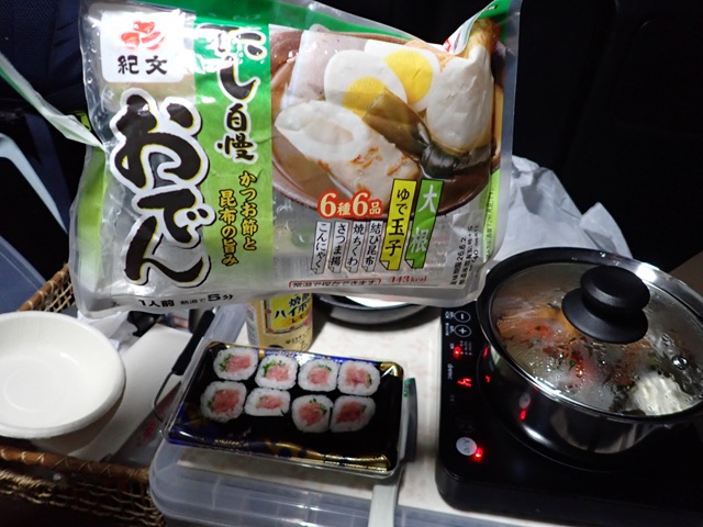 紀文のおでん↑ウインナーとトマトはあとから追加した具材です。これが冬の車中泊の醍醐味でしょか?.. ちと大袈裟かも..