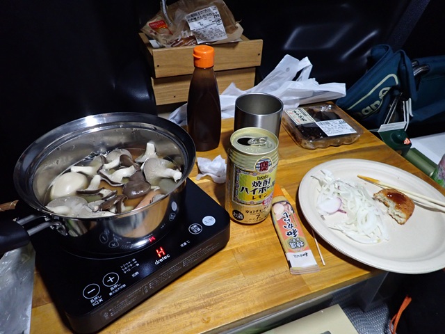 道の駅 ふじおやまに戻りました。身体を芯から温めるためにIHクッキングヒーターのお出まし.. 昨夜と同じくパックのおでんを温めました。