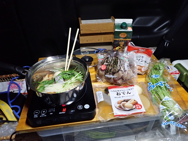 夕飯は寒さしのぎにIHクッキングヒーターでパックのおでんを温めて、水菜にキノコやウインナーを入れてのおでん鍋.. 毛布を羽織って黒霧島のお湯割りで一杯、身体を芯から温めました。