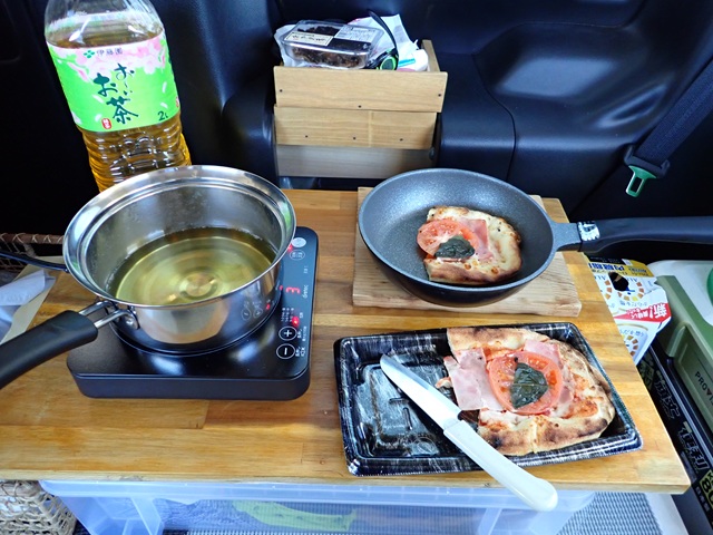 IHクッキングヒーターでピザとお茶を温めるて朝食としました。