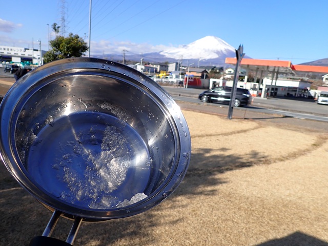 よくよく見てみたら、鍋底の水が凍ってました↑ 一瞬で鍋底が凍るような半端ない寒い朝だったんです。 おそらく夜中の車内は氷点下だったと思われます。恐ろしや真冬の富士山麓の車中泊、これじゃ身体にいいわけないとわかっちゃいるけどやめられない.. 旅は始まったばかりです。どうなってしまうのでしょか?..