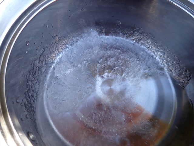 水場で鍋に水を汲んで ゆすいでみたら、 なんだか鍋底が変な感じで..